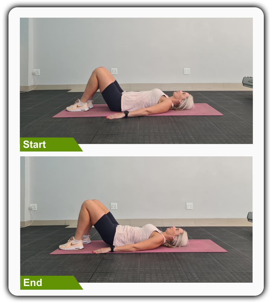 Lie on your back with knees bent and feet flat on the floor. Gently flatten your lower back into the floor by tightening your abdominal muscles. Squeeze your pelvic floor muscles and tilt your pelvis back, squeezing your knees together. Inhale, relax and return to the starting position. Do this for 10-seconds hold, relax, and repeat for 10 times.