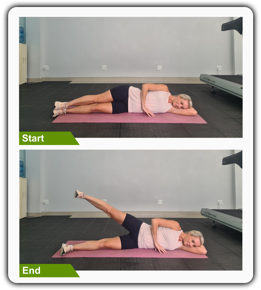 Lie on your side with your legs straight and stacked, hips and shoulders aligned. Bend your bottom elbow and rest your head on your hand, place you top hand on the floor in front of your chest for support. Engage your core and keep your toes pointing forward. Slowly lift your top leg upward without rolling your hips back, then lower it with control. Complete 5 repetitions and repeat the movement on the opposite side.