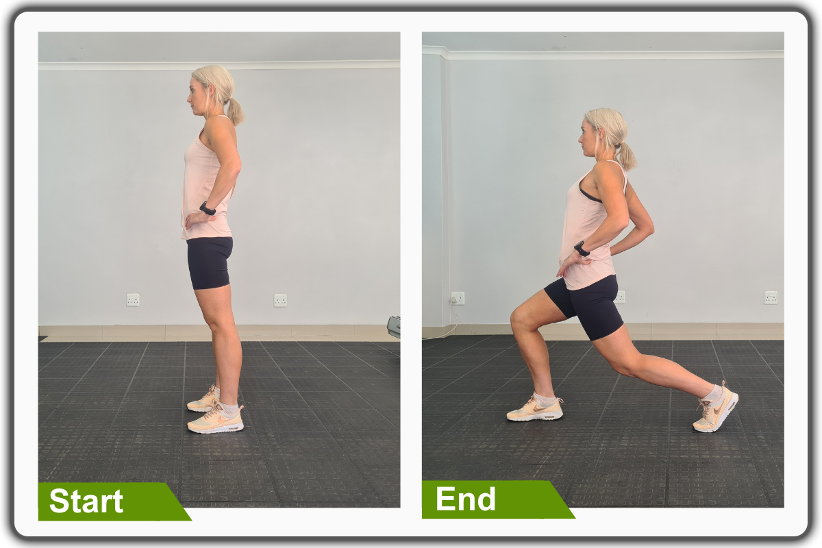 Begin in an upright standing position with your feet hip width apart. Maintain good alignment with your head, shoulders, hips, and legs. Place your hands on your hips. Engage your core muscles. Take a big step forward with one leg, keeping your toes pointing straight ahead and slightly bending both knees. Tighten up your abdominal area and shift your hips forward. Hold this position for 20 seconds. Return to the starting position and repeat the movement on the opposite side.